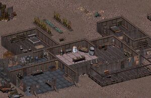 Depot is a small outpost, with 3 lockers, 2 desks (one looks like a workbench), 2 shelves, and 2 table. 9 containers total when you consider it also has a workbench with the standard toolboard for small storage above it and a still. There's also a brahmin pen containing one brahmin. On the map, you can find wood and flint (does not replenish). It's a good and cheap base, and the spawn is straight below the door and chairs outside. Guards can be placed to the far right of the spawn, near the trees. They will have the small spawn area directly in their sight. Base locations seem to typically be somewhere to the West of Klamath. The Depot is sold in Klamath, and is the same price as the Cave, yet offers considerably more in terms of storage space. Depot can be purchased from the base seller Smiley in Klamath. He is located in the bar and hotel at the Main entrance.