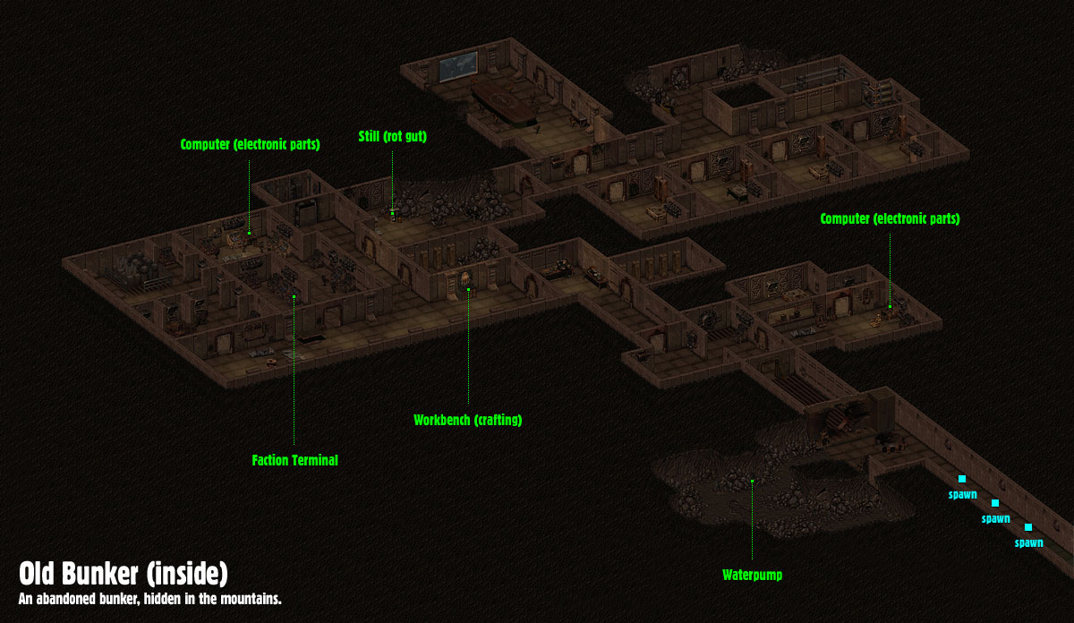 The computers do not yield Electronic Parts, and the elevator does not work, the machines cannot be fixed, the Mr Handy is permanently inoperable, the place is always dirty, and the lights are always off. There has been a small mine up front but it is completely depleted. One of the locker rooms has a locked door, opened with a Pass Key (Yellow). Not shown here is the large outside map near a cliff side with the bunker's entrance.