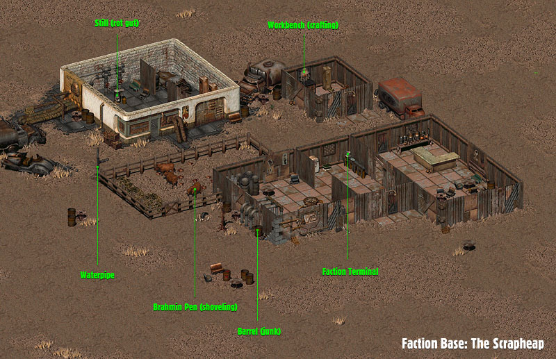 | A bar-style player faction base, with a brahmin pen, and separate buildings for the Rot Gut still and workbench. | |||